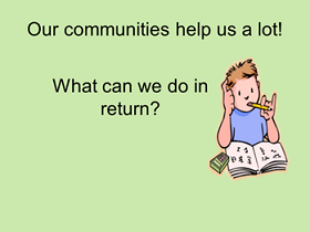 where a group of people lived or shared together. His teacher, Mrs Morris had explained that communities help people in